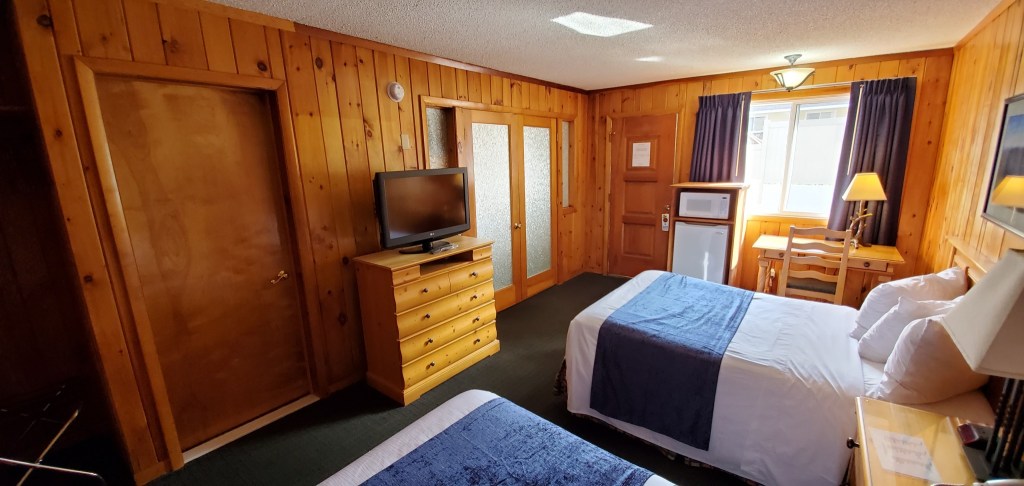 Non smoking suite with 2 double beds in one room and 1 queen bed in separate room accommodating up to 4 adults, 2 children. Mini-frig, microwave, high speed internet, air conditioning, cable HDTV, self-controlled temp, direct dial phone with free US calls, clock radio, smoke alarm, hair dryer, bathtub, and shower. Bistro table and 2 chairs on porch outside room.