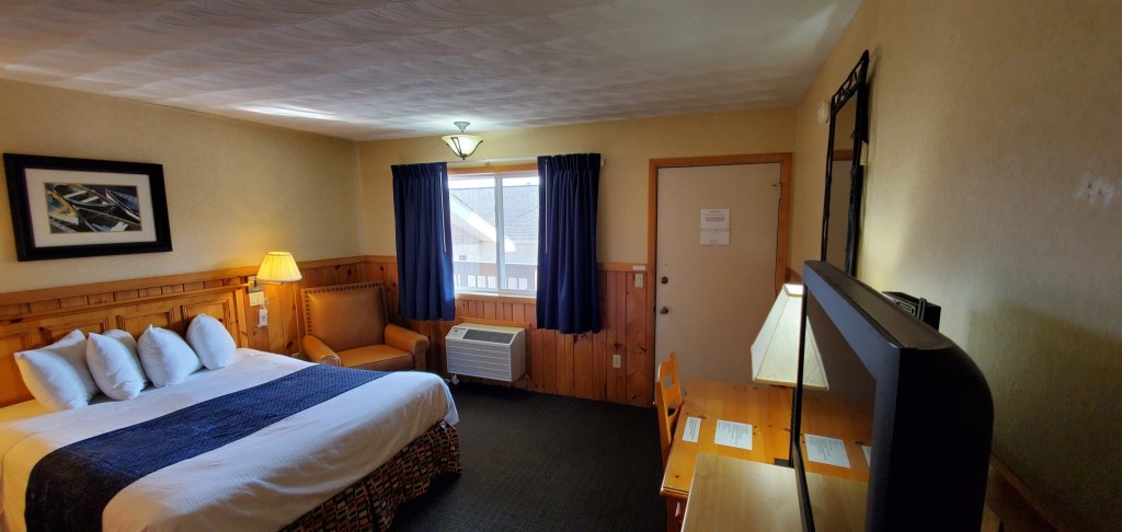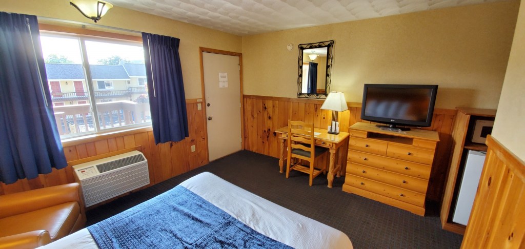 Non smoking room with 1 queen bed accommodating up to 2 adults. Mini-frig, microwave, high speed internet, air conditioning, cable HDTV, self-controlled temp, direct dial phone with free US calls, clock radio, smoke alarm, hair dryer, bathtub, and shower. Bistro table and 2 chairs on balcony outside room.