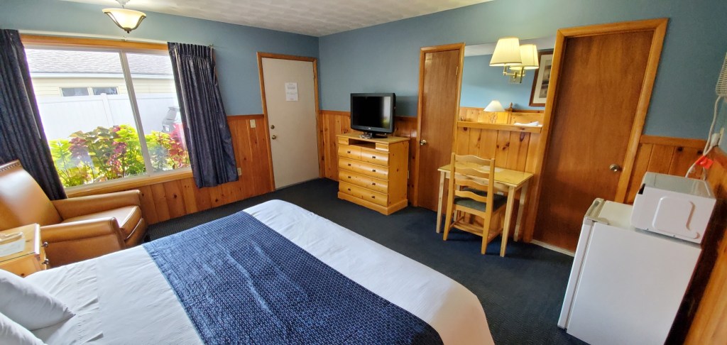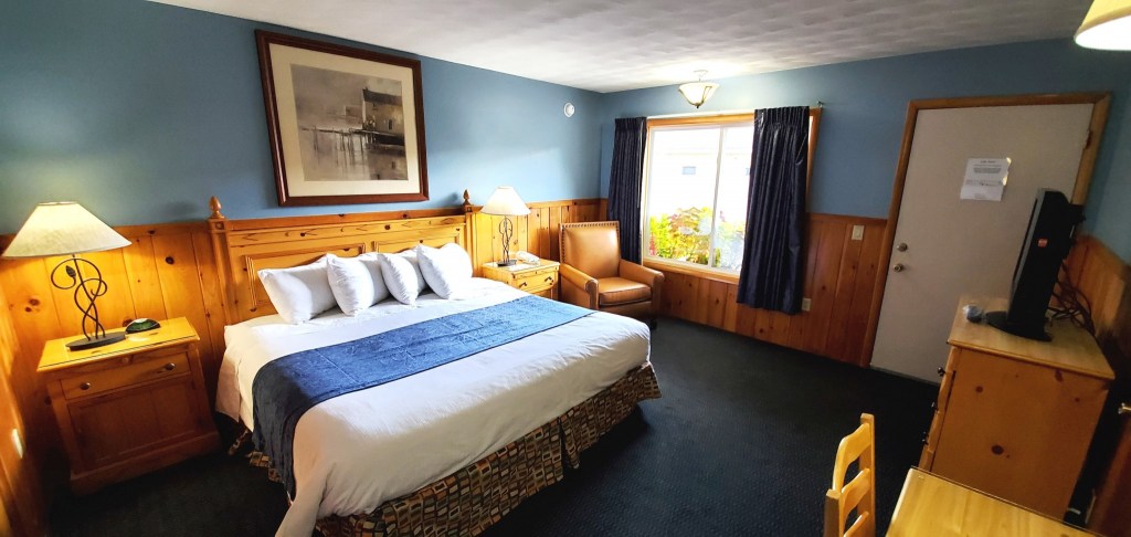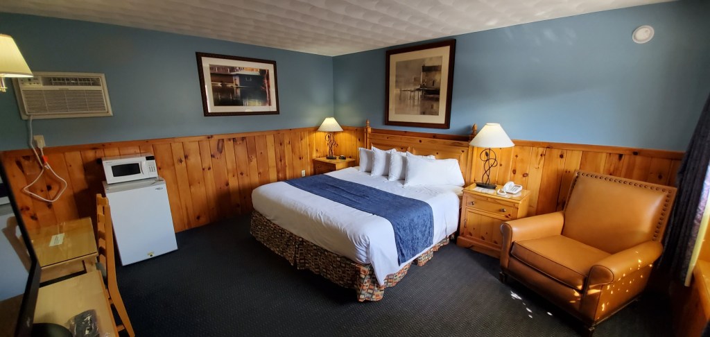 Non smoking room with 1 king bed accommodating up to 2 adults. Mini-frig, microwave, high speed internet, air conditioning, cable HDTV, self-controlled temp, direct dial phone with free US calls, clock radio, smoke alarm, hair dryer, bathtub, and shower. Bistro table and 2 chairs on balcony outside room.