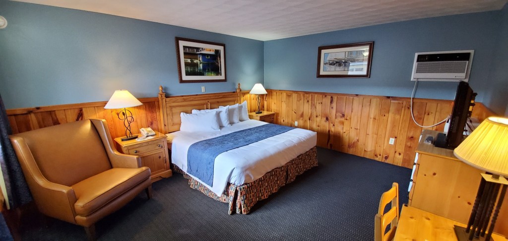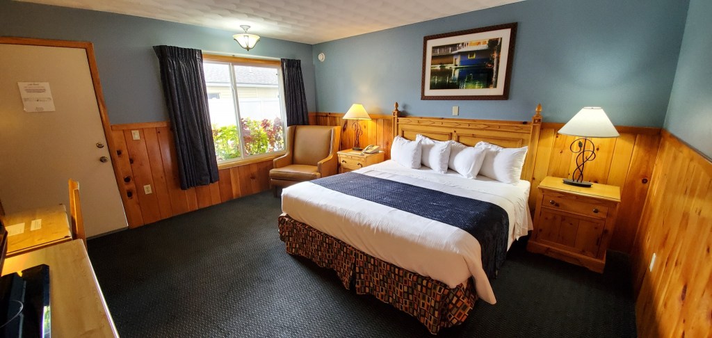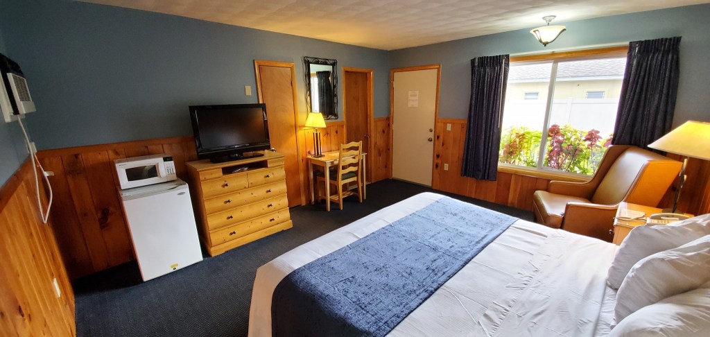 Non smoking room with 1 king bed accommodating up to 2 adults. Mini-frig, microwave, high speed internet, air conditioning, cable HDTV, self-controlled temp, direct dial phone with free US calls, clock radio, smoke alarm, hair dryer, bathtub, and shower. Bistro table and 2 chairs on balcony outside room.