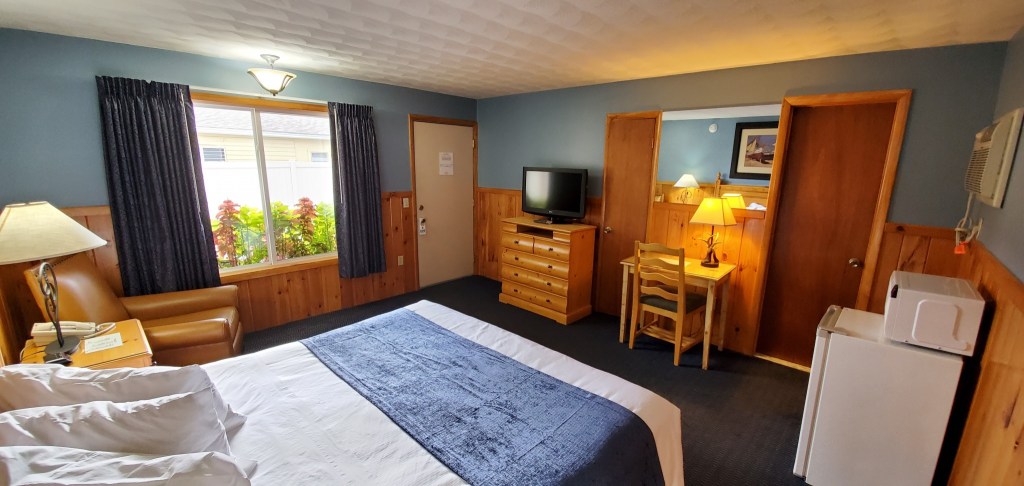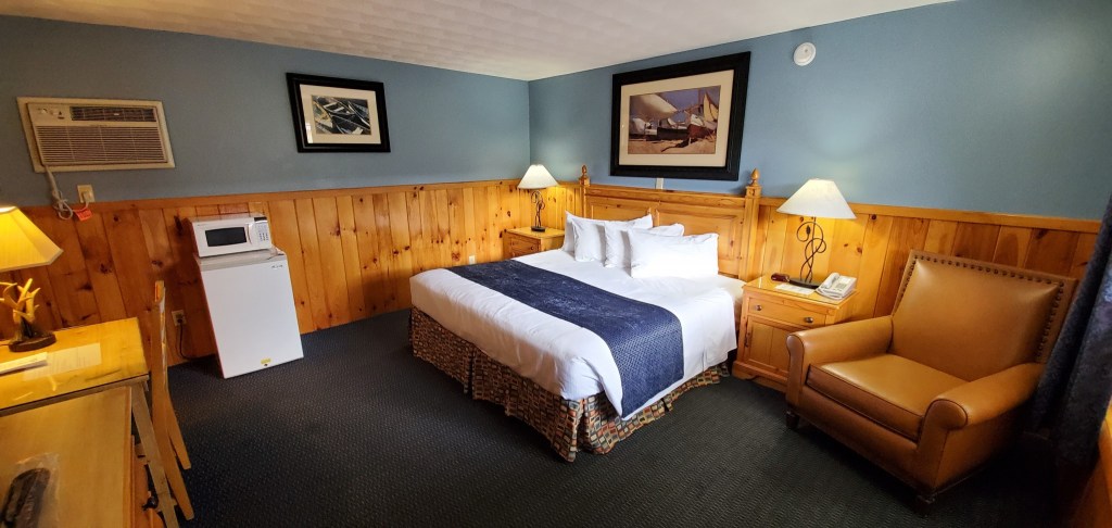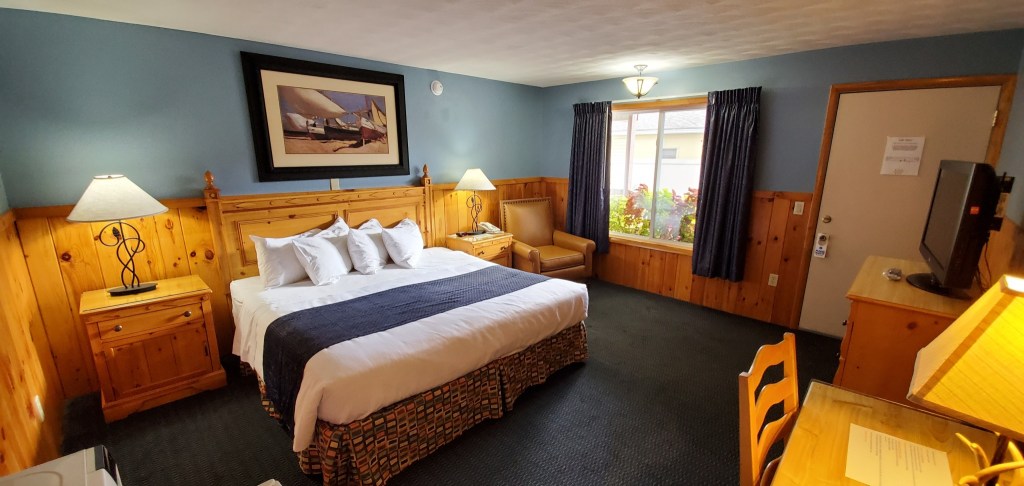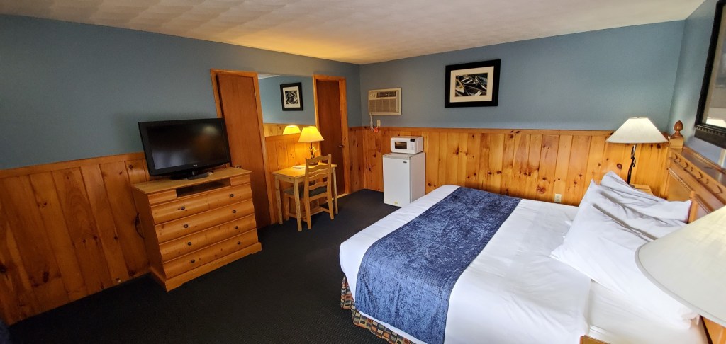 Non smoking room with 1 king bed accommodating up to 2 adults. Mini-frig, microwave, high speed internet, air conditioning, cable HDTV, self-controlled temp, direct dial phone with free US calls, clock radio, smoke alarm, hair dryer, bathtub, and shower. Bistro table and 2 chairs on balcony outside room.