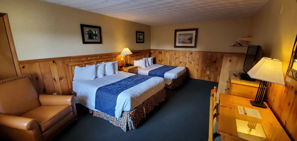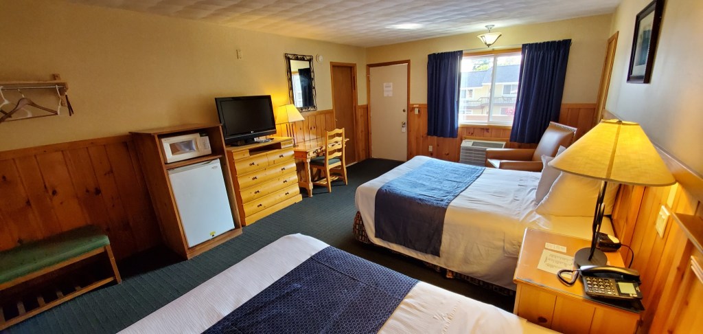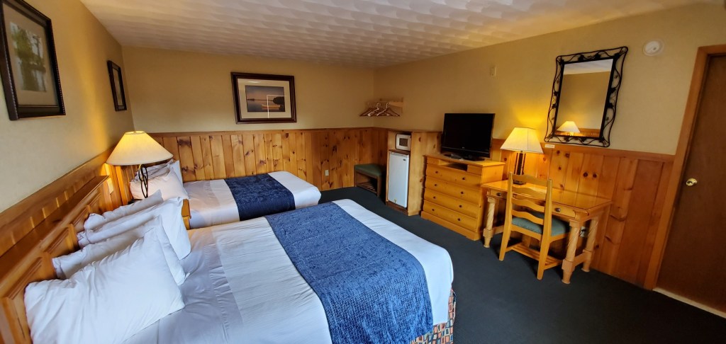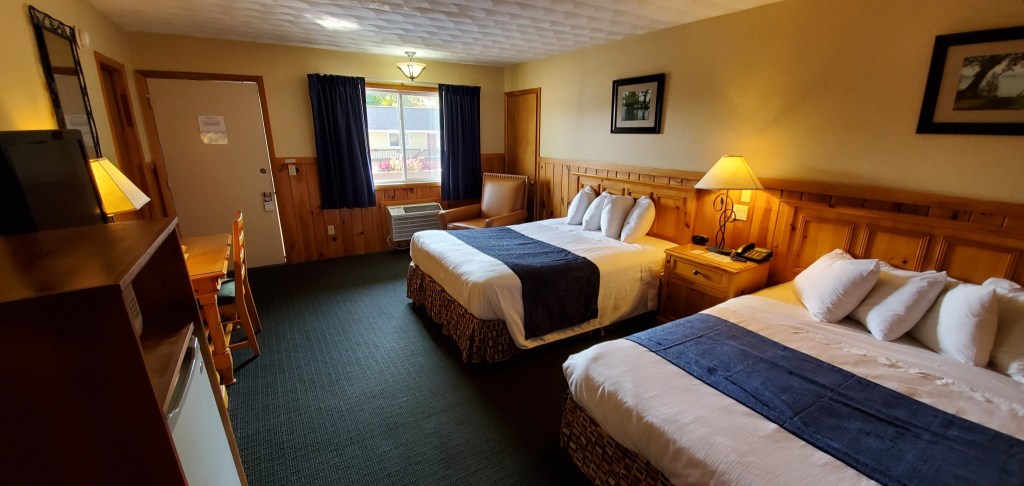 Non smoking room with 2 queen beds accommodating up to 4 adults. Mini-frig, microwave, high speed internet, air conditioning, cable HDTV, self-controlled temp, direct dial phone with free US calls, clock radio, smoke alarm, hair dryer, bathtub, and shower. Bistro table and 2 chairs on balcony outside room.