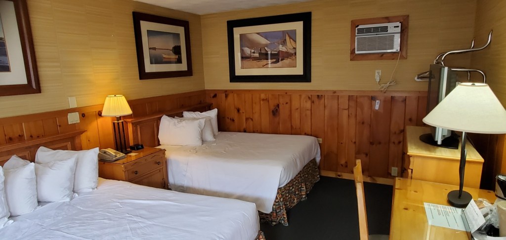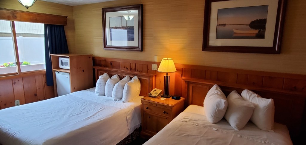 Non smoking room with 1 queen and 1 double bed accommodating up to 4 adults (picture to be updated May 2023). Mini-frig, microwave, high speed internet, air conditioning, cable HDTV, self-controlled temp, direct dial phone with free US calls, clock radio, smoke alarm, hair dryer, bathtub, and shower. Bistro table and 2 chairs on balcony outside room.