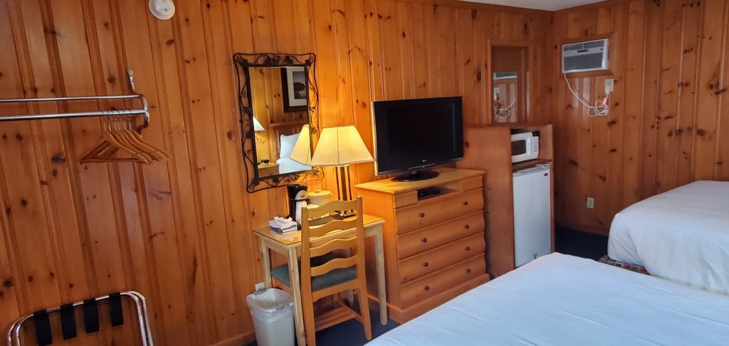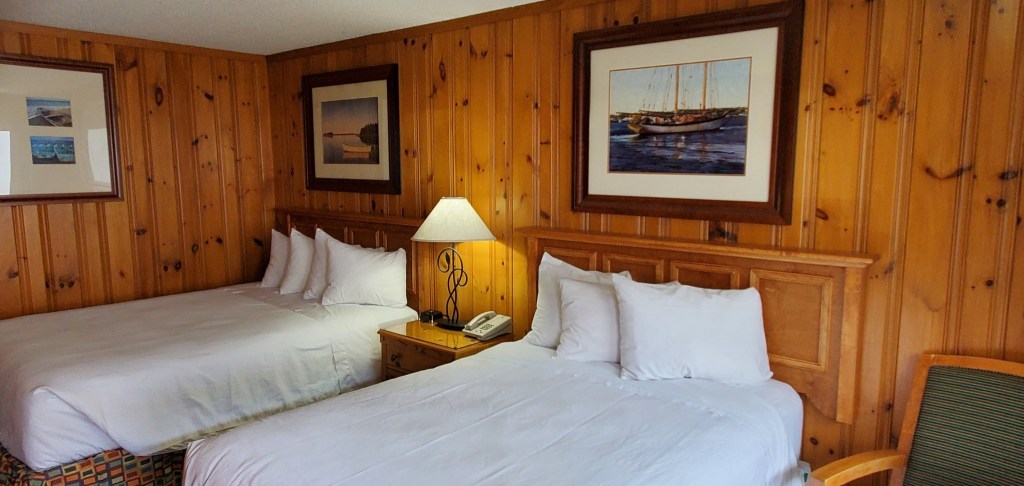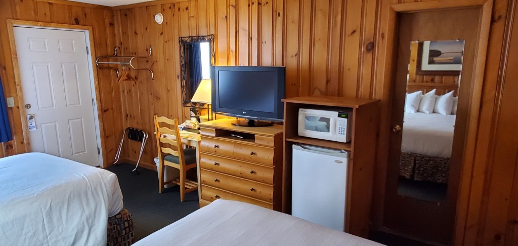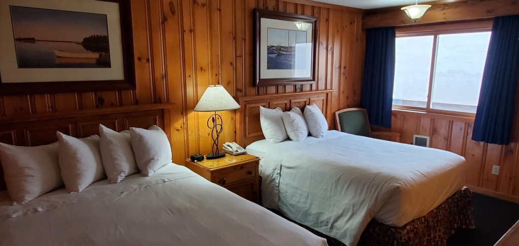 Non smoking room with 1 queen and 1 double bed accommodating up to 4 adults (picture to be updated May 2023). Mini-frig, microwave, high speed internet, air conditioning, cable HDTV, self-controlled temp, direct dial phone with free US calls, clock radio, smoke alarm, hair dryer, bathtub, and shower. Bistro table and 2 chairs on balcony outside room.