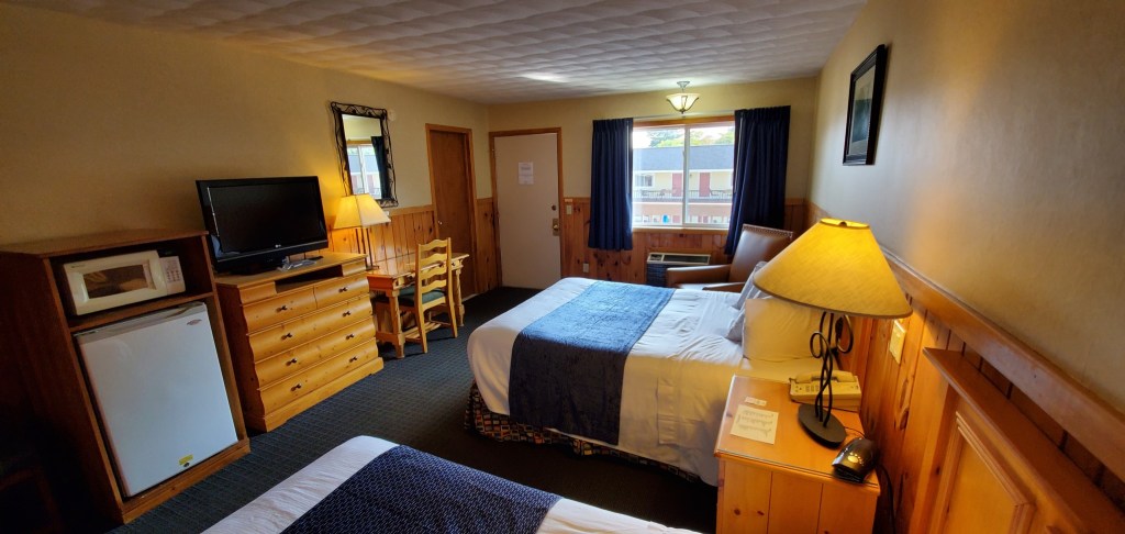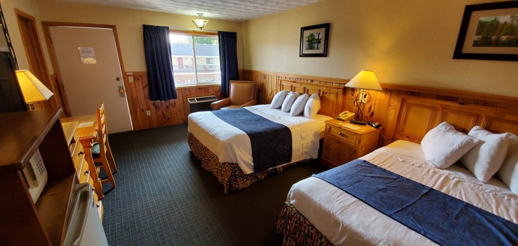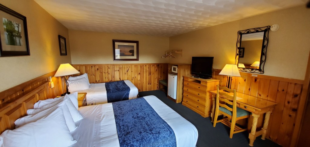 Non smoking room with 1 queen and 1 double bed accommodating up to 2 adults, 2 children. Mini-frig, microwave, high speed internet, air conditioning, cable HDTV, self-controlled temp, direct dial phone with free US calls, clock radio, smoke alarm, hair dryer, bathtub, and shower. Bistro table and 2 chairs on balcony outside room.